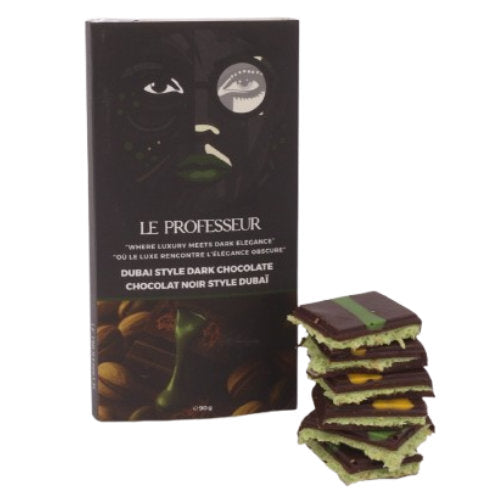 Le Professeur dubai style dark chocolate bars are 90g bars that come in a wholesale case of 12 units.