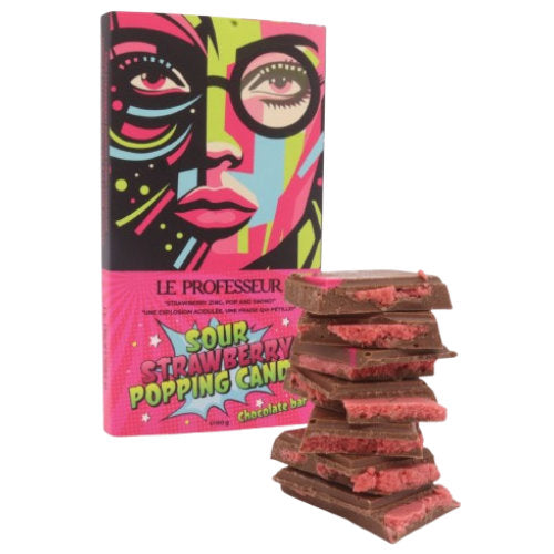 Le Professeur sour strawberry flavoured popping candy chocolate bars are 90g bars that come in a wholesale case of 12 units.