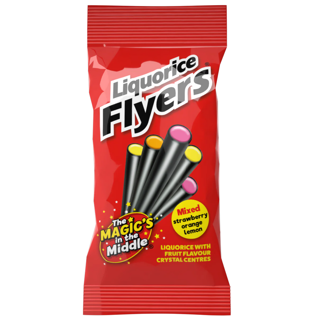Liquorice flyers in a pre-packed bag are long liquorice tubes that are filled with delicious sherbet crystals. These are made by Maxilin and come in a wholesale display box that contains 12 bags of liquorice flyers.