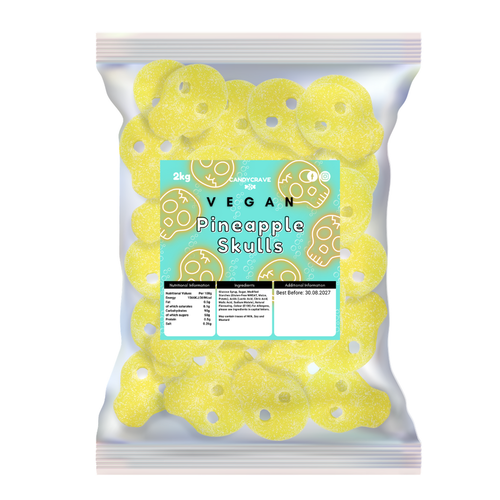 Fizzy pineapple skulls are a delicious vegan approved sweet that comes in a wholesale 2kg bulk bag and is made by Candycrave.